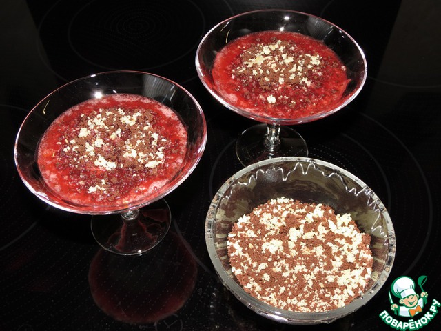 Выложить в креманки слоями ягодное пюре, бисквитную крошку или молотое печенье и творожный крем.