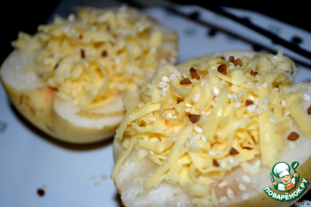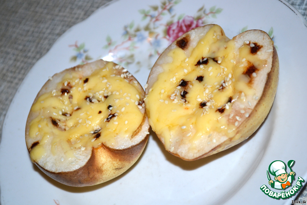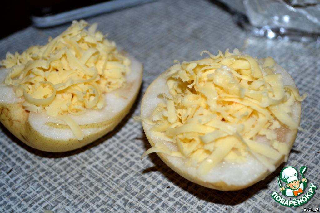 Грушу разрезать пополам, вытащить косточки ложкой, сбрызгнуть соком лимона и положить малюсенький кусочек перца.