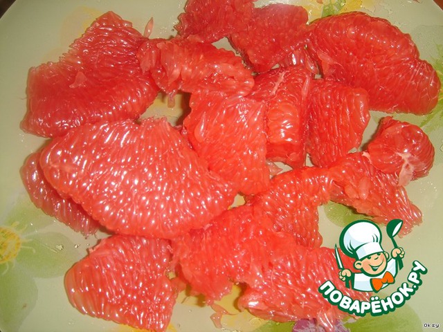 Грейпфрут очистить от шкурки и пленок, дольки должны быть крупными.
