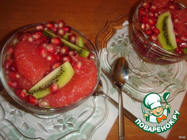 Перемешать зерна граната, киви и грейпфрут, выложить в креманки и полить гранатово-медовым соусом.