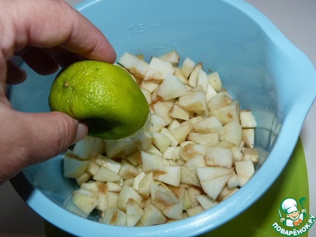 Яблоки (лучше брать плотные) очистить от кожуры и семян, после нарезать кубиками и сбрызнуть соком лимона или лайма (кому как по вкусу).