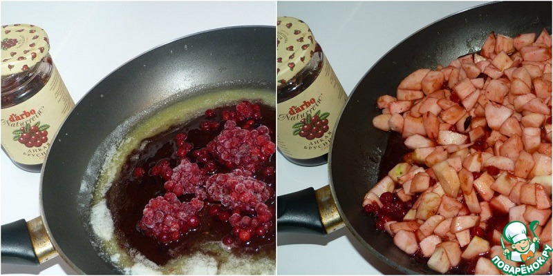 На сковороде растопить сливочное масло (примерно ложку), выложить 2-3 ст. ложки брусничного соуса D"аrbo и замороженные ягоды брусники (если брусника свежая, то ягоды добавляйте в самом конце приготовления).