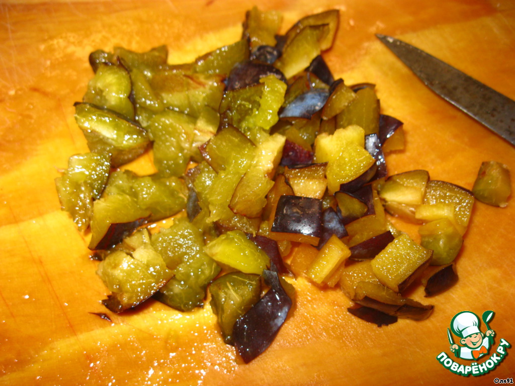 В сливе удаляем косточки и тоже некрупно нарезаем