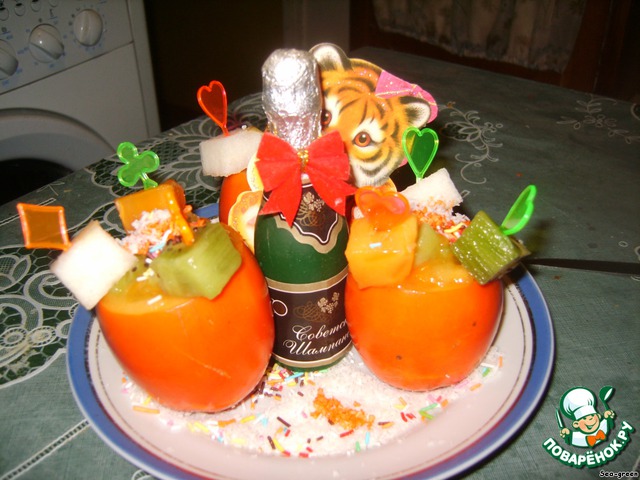 Фруктовые квадратики надеть на шпажки и украсить ими хурму. Можно посыпать все посыпкой и кокосовой стружкой.
