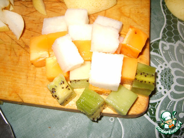 Из любых фруктов (у меня это остатки киви, хурмы и груша) вырезать квадратики.