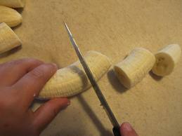 Банан режем на порционные куски и нанизываем на шпажки. Можно использовать целый банан.