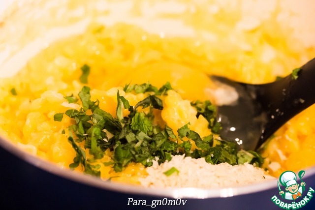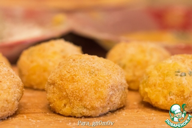 3. Сформировать из риса небольшие шарики диаметром около 5 см. Каждый шарик сначала обвалять в муке, потом обмакнуть в яйцо, затем обвалять в панировочных сухарях.