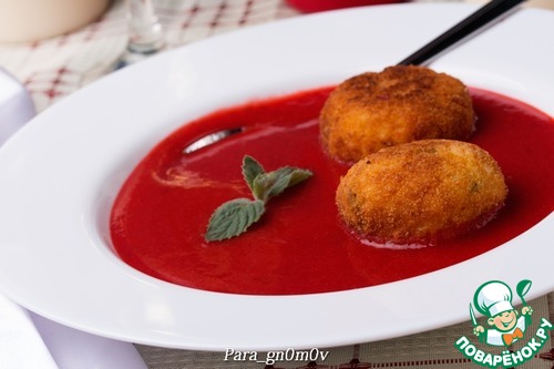 В тарелку налить клубничный суп, выложить по паре аранчини, украсить мятой и подавать.