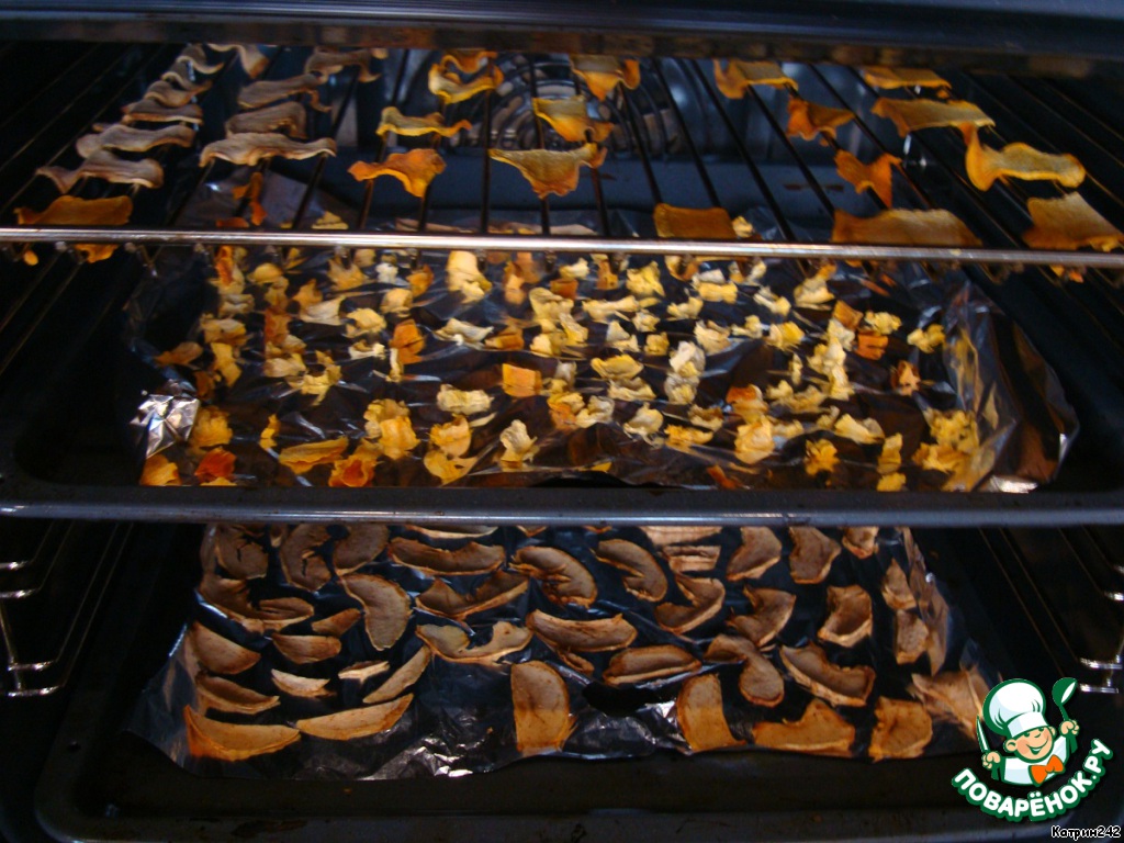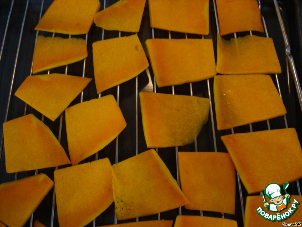 Приготовим наши хрустики. У меня были тыква и яблоки. Нарезаем их тонкими 1-2 мм пластинками, чем тоньше, тем быстрее они приготовятся. Если у вас есть терка Бернера, можете воспользоваться ею, это облегчит Вашу участь. Хрустики можно приготовить в сушке для фруктов и овощей. Я же сушу их в духовке. Тыкву сначала необходимо проварить в подслащенной воде минут 5, либо минут 5 в пароварке. Сушить 3-4 часа при температуре 50-60 градусов, потом 1-2 часа при 70 градусах.