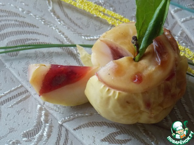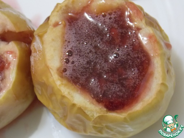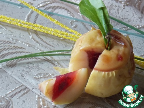 Пока яблоки остывают готовим желе. Для этого желатин заливаем холодной, кипяченой водой. Через 15 мин. на водяной бане распустить желатин и добавить конфитюр. Перемешать. Готовое желе разлить по печеным яблокам, положить крышки и поставить в холодильник на несколько часов до застывания. Украсить на Ваше усмотрение.