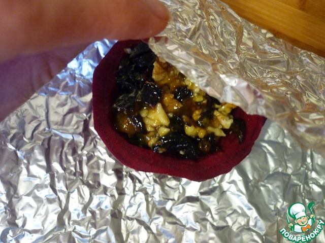 Нафаршировать полученной смесью свеклу и плотно обернуть ее фольгой. Запекать в течение часа при 180 градусах.