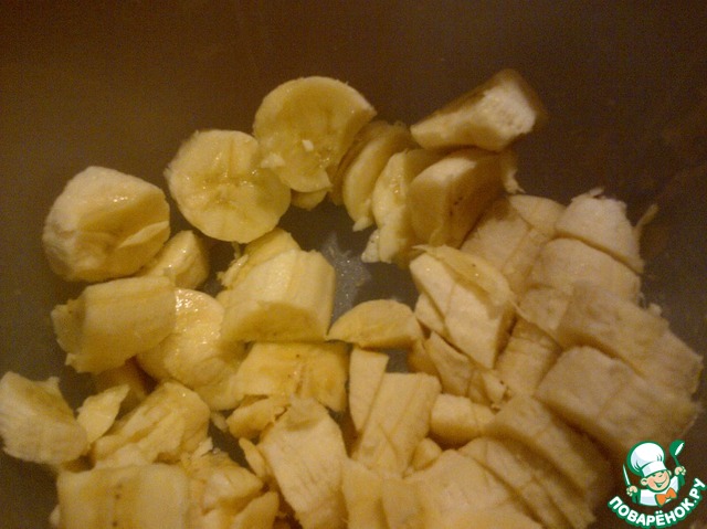 Чистим и режем бананы. Кладём в чашу блендера и заливаем лимонным соком..