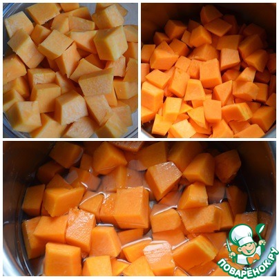 Тыкву очистить, нарезать небольшими кубиками. Сложить в кастрюлю, залить водой. Довести до кипения, накрыть крышкой и варить на среднем огне 20 минут.