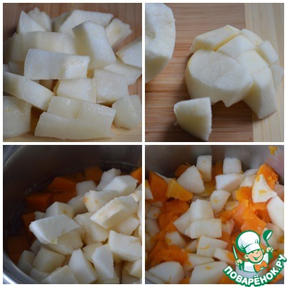 Яблоки и груши очистить от кожуры и семечек. Нарезать кубиками. Добавить к тыкве, которая варилась 20 минут, перемешать, накрыть крышкой и варить еще 5 минут. Через 5 минут выключить и оставить остывать при комнатной температуре. Когда остынет, откинуть на дуршлаг, чтобы избавиться от лишней жидкости, буквально на минуту. Теперь перебить все погружным блендером до однородного состояния. Добавить имбирь, корицу, лимонный сок и растительное масло, перемешать блендером. Если тыква не сладкая, можно добавить немножко меда. Готовый десерт выложить в креманки и украсить измельченными орехами.
