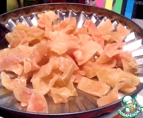 6) И так, сироп впитался почти полностью, берем противень, застилаем бумагой для выпечки, выкладываем на нее арбузные цукаты, ставим в духовку на 30-40 С и высушиваем до готовности. Степень готовности каждый определяет для себя сам: захотели чуть мягкими достали, захотели высушили посильнее.