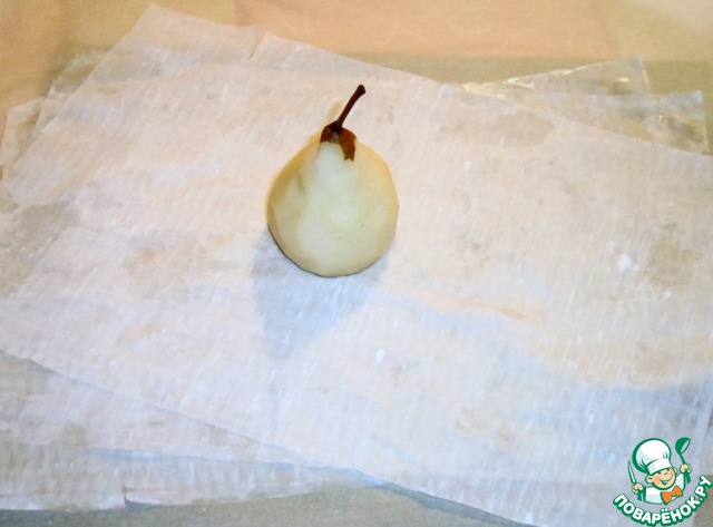 Для каждой груши понадобится 3 листа теста. У меня были большие листы теста, я разрезала их пополам. Положите 1 лист теста фило, слегка смажьте его маслом. На него положите второй лист, слегка смажьте маслом и сверху положите третий лист, смажьте уголки маслом. Поставьте в центр грушу и заверните ее в тесто,