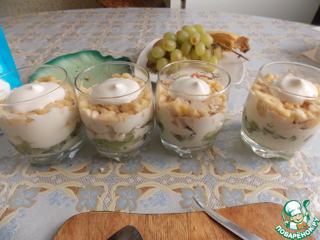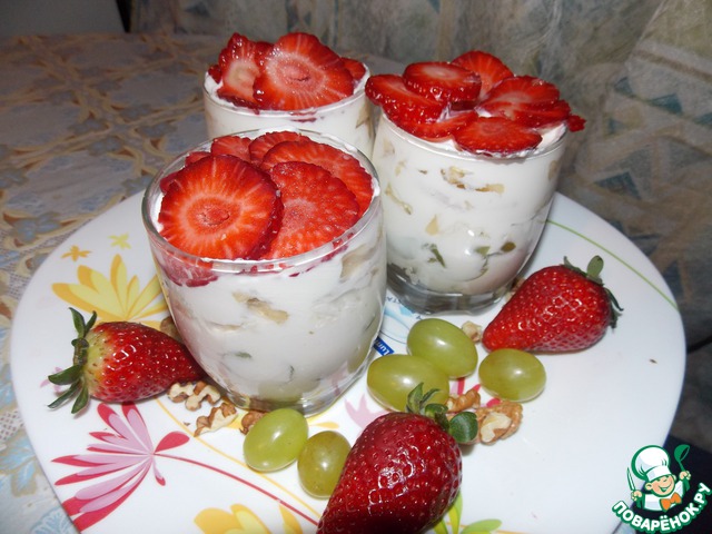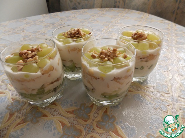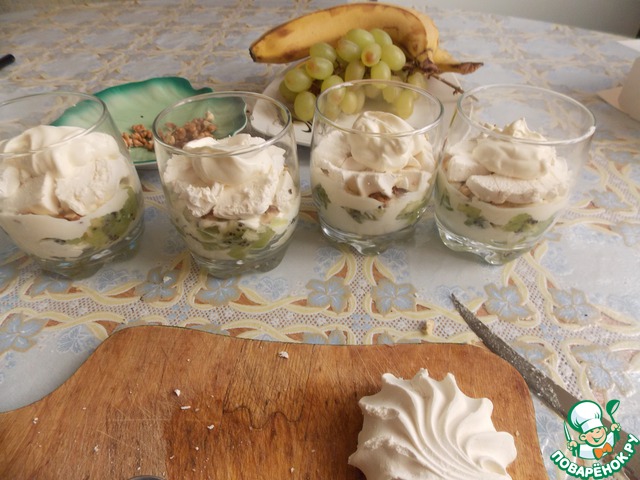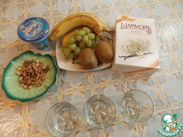 1 слой зефир ( порезанный кубиками) смазываем его сметанной и посыпаем измельченными орешками,2 слой киви (порезанный кубиками) опять промазываем сметаной и посыпаем орешками, затем опять слой порезанного зефира и опять смазываем слой сметанной и посыпаем орешками, потом слой порезанных кубиками бананов, смазываем сметанной украшаем сверху виноградом и орешками и в холодильник на 1-2 часа
