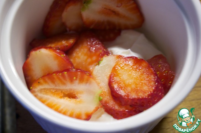На дно креманки выложить творог и сверху присыпать клубникой.