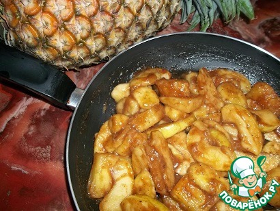 На сковороде растопить 1ст. л. масла и обжарить четвертинки ананаса по 2 минуты с каждой стороны.
