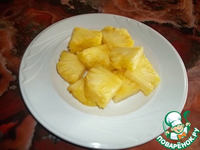Ананас очистить, нарезать кольцами. Взять 3 кружочка, разрезать на 4 части.
