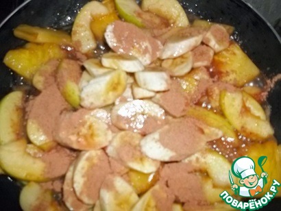 Добавить бананы, посыпать корицей и осторожно помешивая жарить несколько минут.