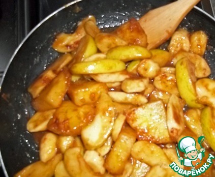 К ананасу добавить яблоки и полить медом с вином. Жарить на небольшом огне, помешивая, еще около 5 минут