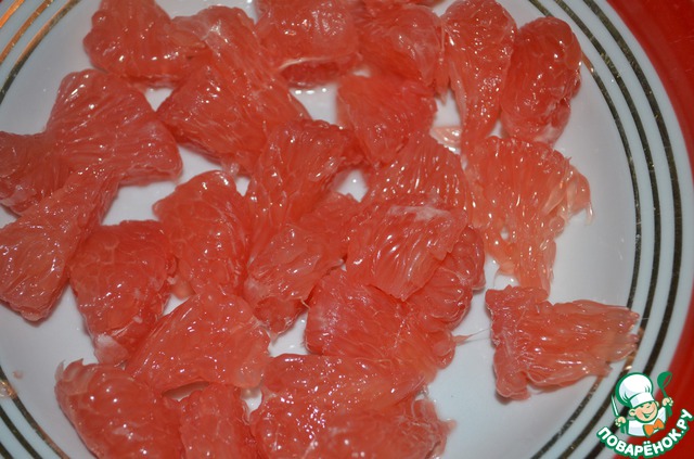 1. Почистим грейпфрут от кожуры и дольки от пленки. Каждую дольку нарезать на небольшие кусочки.