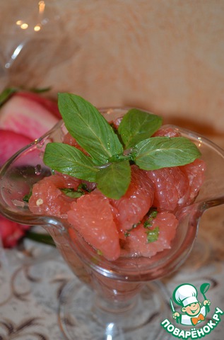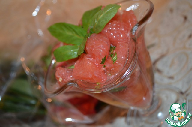 4. Смешиваем грейпфрут с готовой заправкой и украшаем листочками мяты. Подаем в креманках.