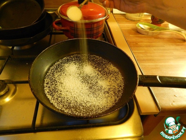 Ставим сковородку на маленький огонь, посыпаем сахаром.