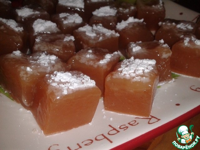 После застывания выкладываем на сахарную пудру или сахар, разрезаем и наслаждаемся мармеладками, зелёный чай подойдёт в самый раз!