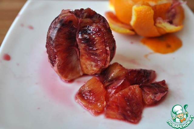 Берём апельсин (у меня красный), чистим, филеруем, нарезаем маленькими кусочками.