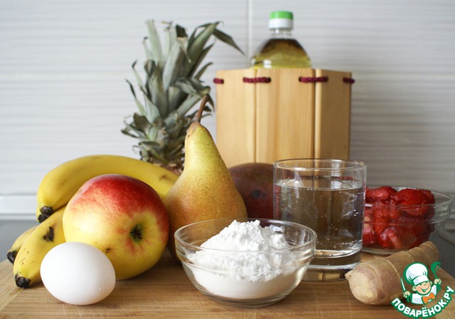 Подготовить продукты. Тщательно вымыть фрукты. Клубнику разморозить. Смешать пшеничную муку с рисовой в пропорции 1:1 (можно обойтись только пшеничной), добавить чайную ложку крахмала и перемешать.