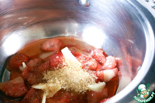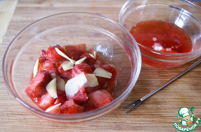 Приготовить соус: отделить сок от ягод клубники. В соке развести полчайной ложки крахмала. Кусочек имбиря в 1 см, тонко нарезать на лепестки и смешать с ягодами клубники.
