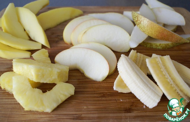 Подготовить фрукты: очистить и нарезать приблизительно одинаковыми кусочками. Фрукты промакнуть бумажными салфетками, они должны быть сухими.
