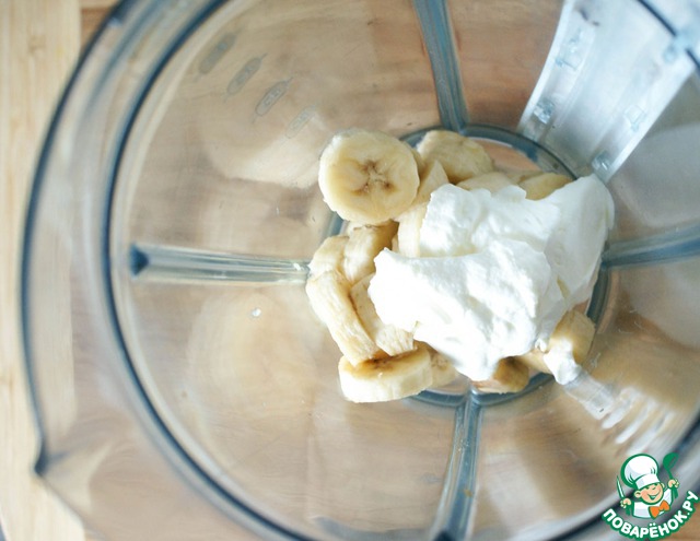 Пока фрукты "сушатся" на полотенцах, извлечь из морозилки замерзшие бананы и взбить блендером до пышной массы. Таким образом мы получим полезное мороженое, которое в растаявшем виде превращается в нежный крем. (У меня к бананам добавлена ложка греческого йогурта).