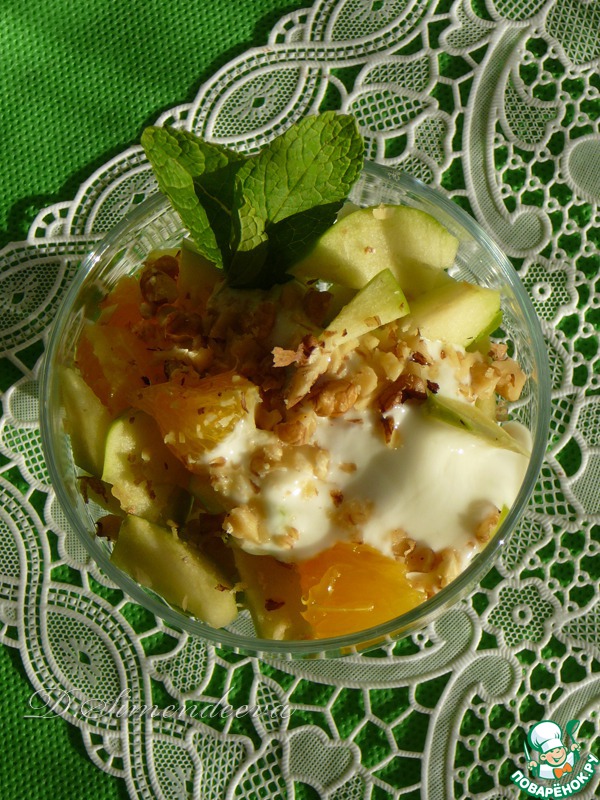 Яблоки смешайте с апельсинами и заправьте йогуртом. Уложите салат в вазочки, посыпьте орехами.