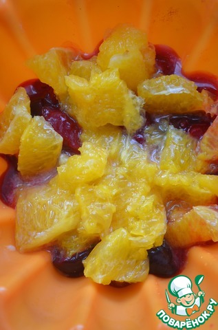 Выделившийся сок собрать, добавить в него готовый апельсиновый сок, чтобы получился 0,5 ст. Половину желатина 5г залить холодной водой 2ст. л, оставить для набухания, после распустить на водяной бане, добавить апельсиновый сок. Вишню с конфитюром выложить на дно формочки, сверху измельченный апельсин