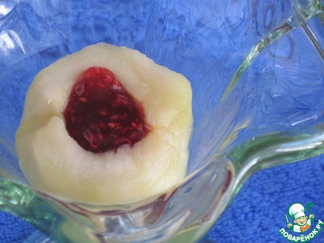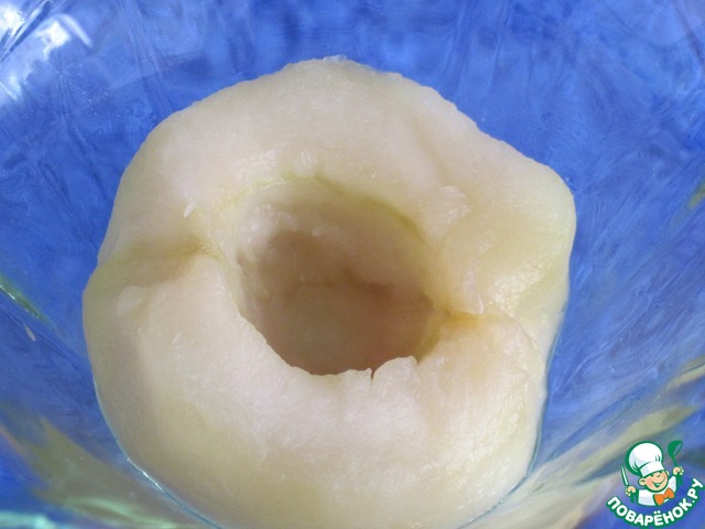 Затем вынуть из сиропа яблоки и остудить их. В отваренных яблоках аккуратно сделать углубление. Яблоки положить в формочки для желе.