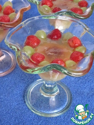 Для украшения добавить по желанию немного ягод замороженной клубники и винограда, долить еще желе сверху и поставить в холодильник до полного застывания.