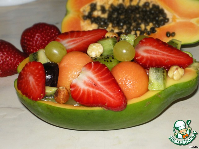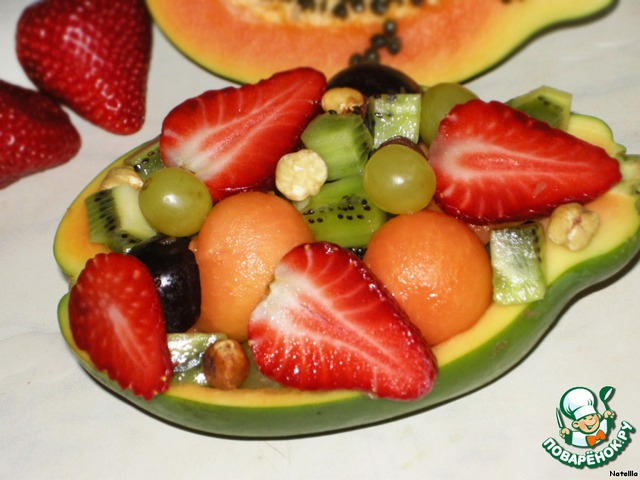 Все фрукты сложить в лодочку из папайи, посыпать орешками и немедленно подать.