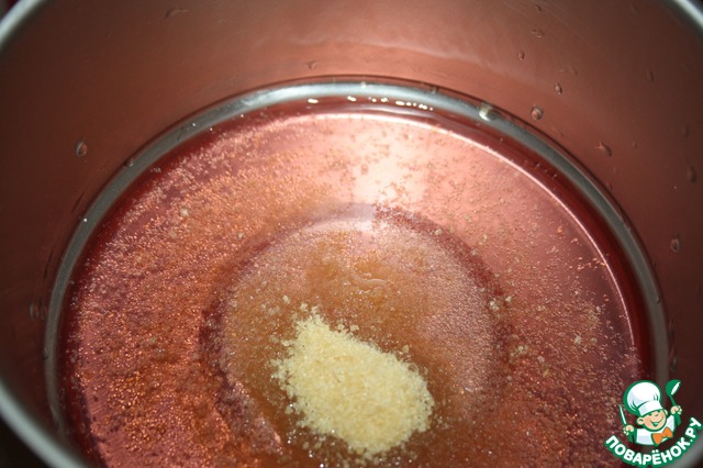 Желатин развести небольшим количеством сока, поставить на медленный огонь, довести до растворения желатина, постоянно помешивая. Не кипятить. Смешать желатиновую жидкость с остальным соком.