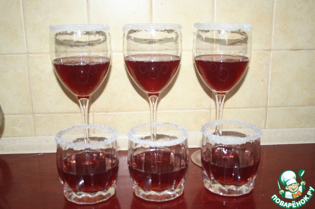 Разлить сок по бокалам. У меня получилось 3 бокала по 0,28 л и 3 бокала по 0,2 л (объем до края бокала). Прежде чем залить сок, я сделала сахарный бортик на бокале. Для этого нужно перевернуть бокал и окунуть в небольшой слой воды, затем сахара. Отправить в холодильник для застывания желе на час-полтора.