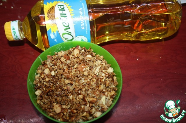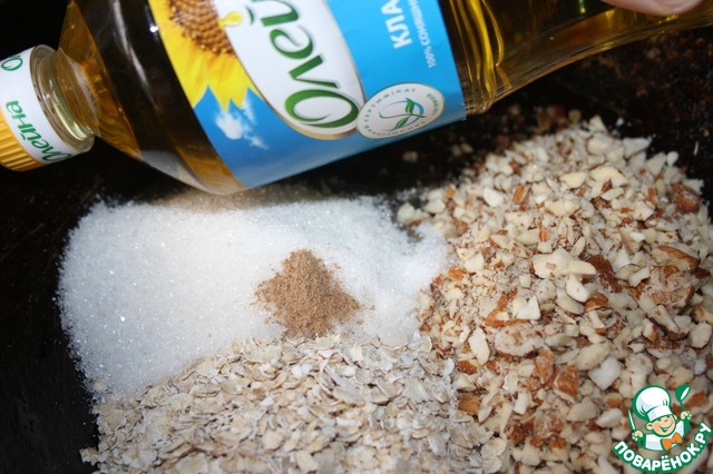 Готовим грильяж. Для этого перемалываем орехи до крупной фракции. На сковороде разогреваем растительное масло, добавляем сахар, овсяные хлопья, корицу, орехи. Жарим на среднем огне, постоянно помешивая до карамелизации сахара.