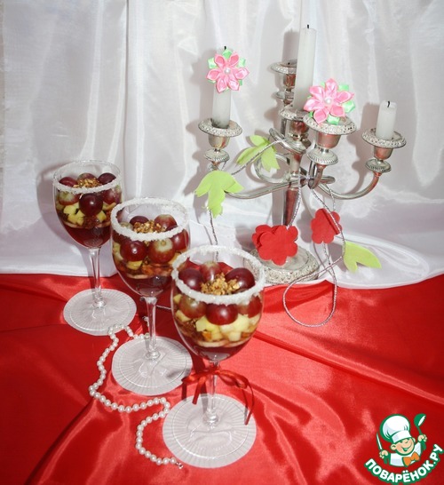Яблоки очищаем от кожицы и сердцевины. Порезать кубиками, залить водой, засыпать сахаром, слегка приварить. Яблочные кусочки должны быть целенькими! Можно сохранить небольшой хруст. Охладить. Выложить следующим слоем в бокал. Затем половинки виноградных ягод и остаток грильяжа. Можно подавать!