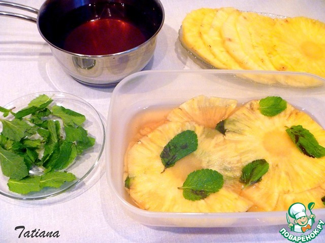 Ананасовые диски сложите в широкий контейнер, перекладывая слои листочками мяты, влейте горячий сироп, закройте контейнер крышкой, отставьте пропитываться часов 6, и более.