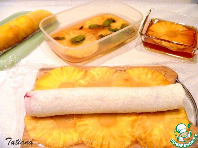 Рисовый рулет освободите от пленки, положите на ананасовую подложку, заверните рулетом с помощью пленки (подогнув боковые края пленки).