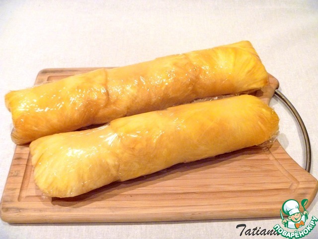 Рабочую поверхность выстелите пищевой пленкой. Ананасовый диск обмакните в желейный сироп, выложите ананасовую подложку ( выкладывайте в нахлест = 6 дисков )длиной чуть более длины рисовой трубы, шириной 15-20 см.