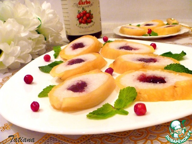 | Десертный рулет из ананаса-прекрасная возможность порадовать себя, домашних, и ваших гостей! Нежный, лёгкий, освежающий десерт с кокосовым рисом и ярким клюквенным желе украсит ваш праздничный стол! |