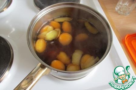 0,5 литра воды наливаем в кастрюльку, засыпаем сахар, добавляем бутончики гвоздики и цедру половины лимона, добавляем фаршированную курагу и варим на малом огне 10 минут