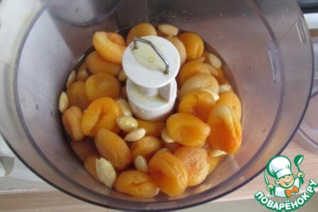 Измельчаем до однородности. Курага измельчается очень хорошо, а миндаль остаётся очень мелкими кусочками. Можно протереть смесь через сито, но мне нравятся кусочки миндаля в десерте.